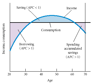 이러한 구조는 미시경제학에서도 연구되어진 토픽인데, 1950년대 모딜리아니 교수는 Life cycle income 이론으로 노벨 경제학상을 받았다. 관련 도표는 아래와 같다. 쉽게 말하면 지출은 어느정도 일정한데 수입이 못따라 주기 때문에 30대까지는 빚을 지고 산다는 이야기다.