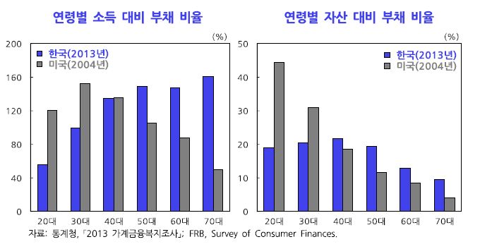 이 데이타를 보면 미국의 경우 life cycle hypothesis가 상당수 맞는 것을 볼 수 있다. 왼쪽 차트에서 미국은 20/30대는 소득대비 부채가 높다가 연령대가 높아지면서 부채비율이 작아진다. 한국의 경우는 정반대이다. 나이가 들수록 부채의 비율이 커지고 있다.