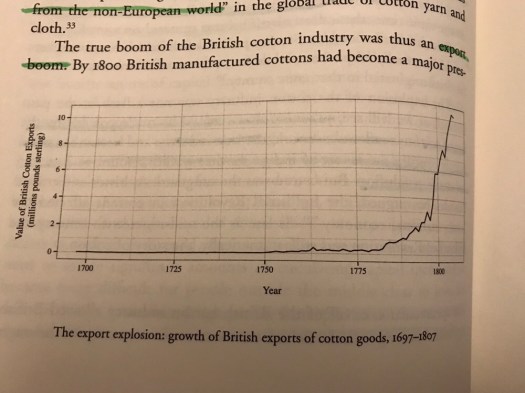 영국 국회는 1774년 캘리코법을 폐지한다. 그리고 영국 면직물 산업은 바로 수출 붐을 맞이한다. 아래 그림을 보면 캘리코법 폐지 이후 면직물 수출은 기하급수적으로 성장한다. 17세기 후반이 되면 영국 면직물 생산의 61.3%를 수출하는데, 이게 자유무역으로 태세전환한지 20여년 만의 일이다.