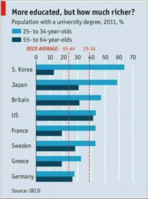 또 위의 이코노미스트 자료를 보면, 빨간 점선이 OECD 평균 대학 진학률인데, 30년 만에 약 18% 정도 증가 한 것을 볼 수 있다. 전세계적으로도 대학진학률은 높아지는 추세이고 대학의 임금 프리미엄은 점점 약해지고 있다. (관련해서 관심있으신 분들은 링크 자료로 들어가면 참고자료 리스트가 잘 정리되어 있다. 참조하시길.)