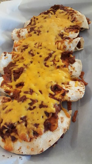 멕시코에서 주식으로 먹는 또띠아를 살짝 부풀 정도 후라이판에 굽는다. (원래는 기름에 튀기는 건데, 튀김은 너무 번거러워서 패스.) 그다음에 또띠아 한면에 칠리를 바르고 치즈를 뿌린다음 돌돌 만다. 이걸 오븐에다 15분 정도 베이킹하면 완성.