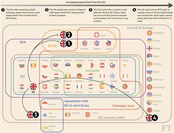 참고로 브렉시트를 두고서 이야기가 되었던 모델은 네가지가 있는데 노르웨이, 스위스, 터키, 러시아 모델이다. EU와 결합정도가 강한 순서이다. (모델 설명은 아래 도표 참조)