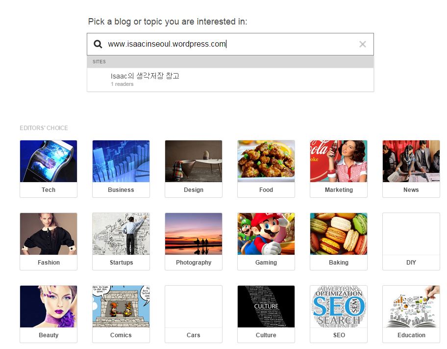 이런 화면을 보게 되는데, 굳이 RSS 주소를 알아낼 필요 없이 검색창에 바로 주소나 Site 이름을 치면 된다. 대부분 Site가 검색으로 나오는 데, 아주 작은 site 같은 경우 (이를테면, 내 블로그라던지…) 아래와 같이 직접 주소를 입력해야 한다. 참고로 내 블로그 주소는 http://www.isaacinseoul.wordpress.com 이다.