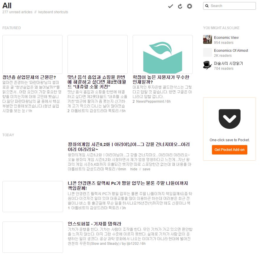 어제 포스팅한대로, 나는 RSS를 애용한다. 어제 Netvibes를 소개하는 포스팅을 하면서 RSS Reader를 조사해봤는데, Feedly가 더 인기가 좋다는 사실을 알게 되었다. 그래서 사용해 봤는데 훨씬 편하다.