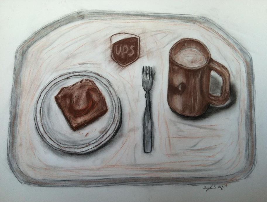 매일 회사식당에서 먹는 아침 식사와 트레이를 스케치해봤다. UPS 로고를 넣은 것은 의도된 것이지만 너무 진하게 들어간 듯해서 아쉽다. 재료는 목탄화에다가 콘테크래용으로 컬러 액센트를 넣어주었다. 사진을 살짝 삐뚤게 찍어서 사진으로 본 그림도 삐뚤게 보인다…ㅎㅎ